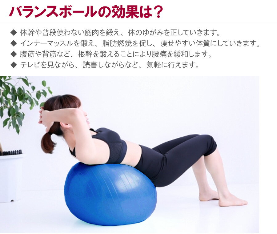 【セット内容】バランスボール、ポンプ 【カラー】ブルー、レッド、ピンク、グレー、パープル 【本体サイズ】 直径65cm 【耐荷重】約200kg 【材質】PVC