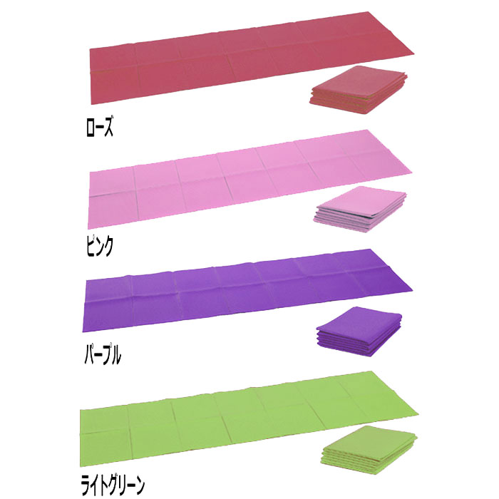 ヨガマット サイズ 横170cm 縦61cm 厚み5mm サイズ(折り畳み時) 25cm×31cm 厚み8cm カラー 全8色:ローズ、ピンク、パープル、ライトグリーン、グリーン、ブルー、オレンジ、ブラック 材質 PVC 使用方法 ●フローリングや畳の上など床が固くても痛くならないです。