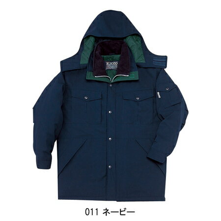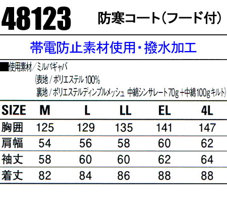 M〜LL 3L(EL) 4L撥水防寒コート 自重堂48123の商品詳細 作業服の商品詳細 品 番 自重堂 48123 シーズン 秋冬用素 材 表地/ポリエステル100% 裏地/ポリエステルディンブルメッシュ 中綿シンサレート70g + 中綿100gキルト カラー 011 ネービー 012 グリーン 帯電防止素材使用 撥水加工 フード取外し可 機能詳細一覧はこちら 作業服の上下セットを選ぶ際は同シリーズからお選び下さい。